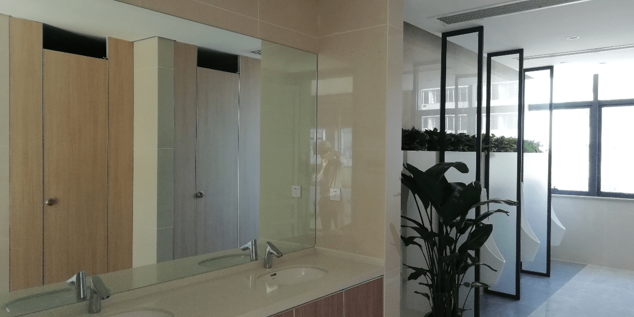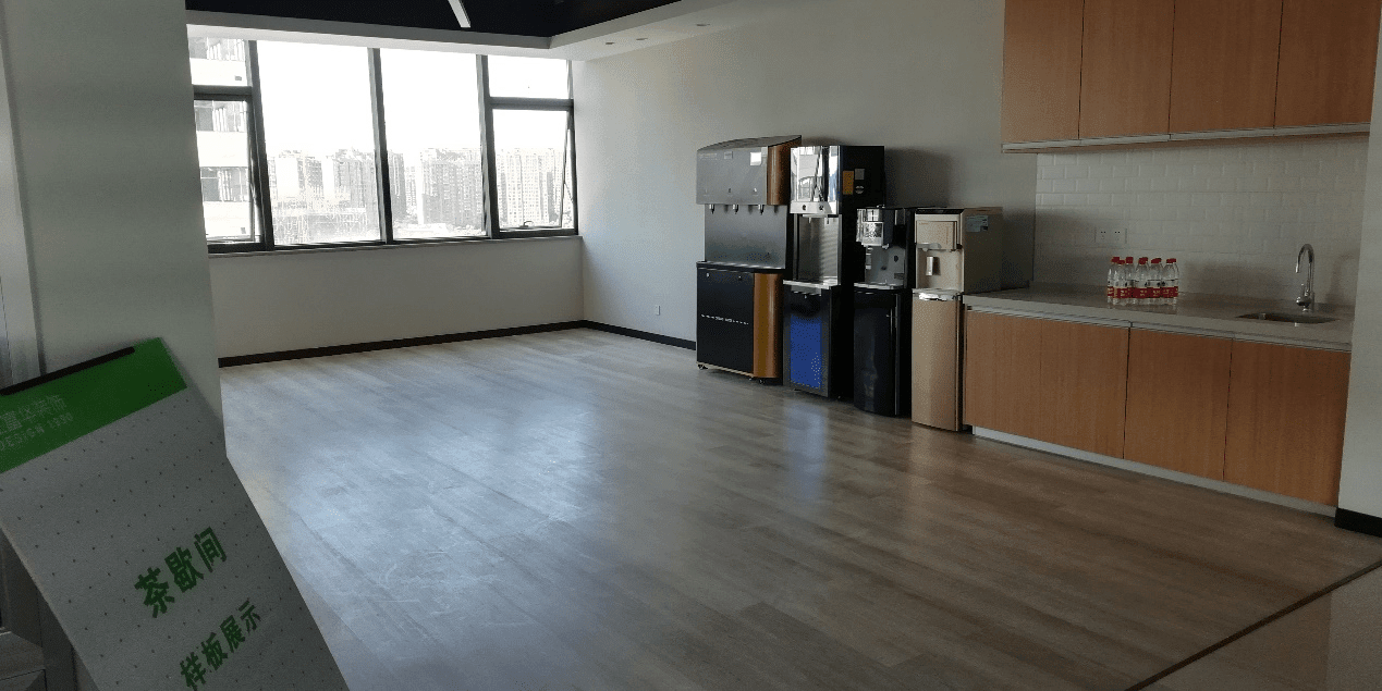 茶歇間面積夠大,而且采光非常好。在里面擺上一些家具和凈水設備,供大家下午茶時間喝杯咖啡,聊聊天,舒緩一天的勞累。衛生間采光也很好,種有綠植,比較養眼。最讓我們驚訝的一點是,所有馬桶都是用的TOTO的智能馬桶,功能強大,推開隔間門馬桶蓋就自動打開了,大家到時候可以感受一下。從功能區這側的窗戶看過去,是高檔住宅小區和一個人造湖,視野還是很寬闊的。