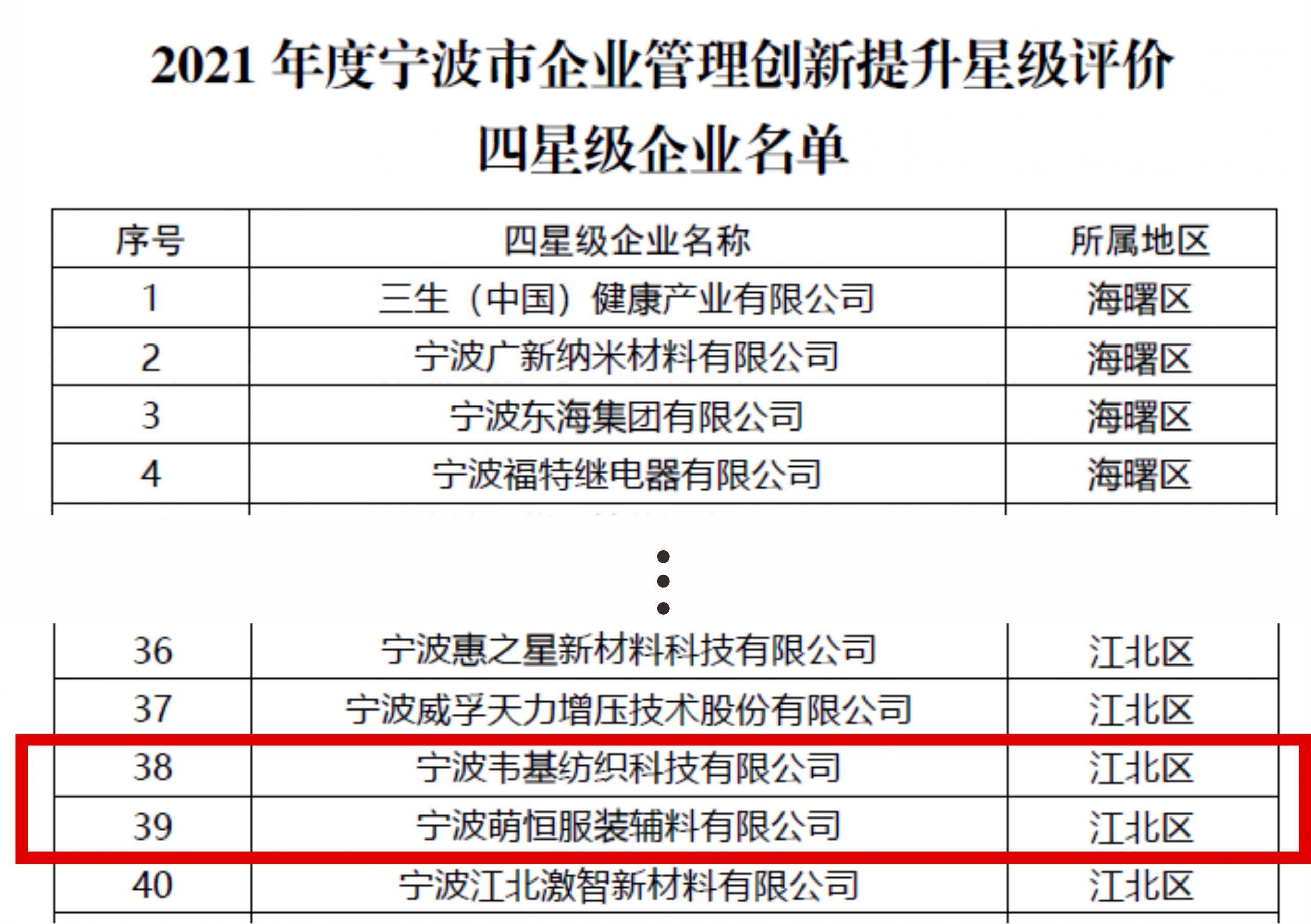韋基紡織科技有限公司、萌恒服裝輔料有限公司獲批寧波市企業(yè)管理創(chuàng)新四星級企業(yè)