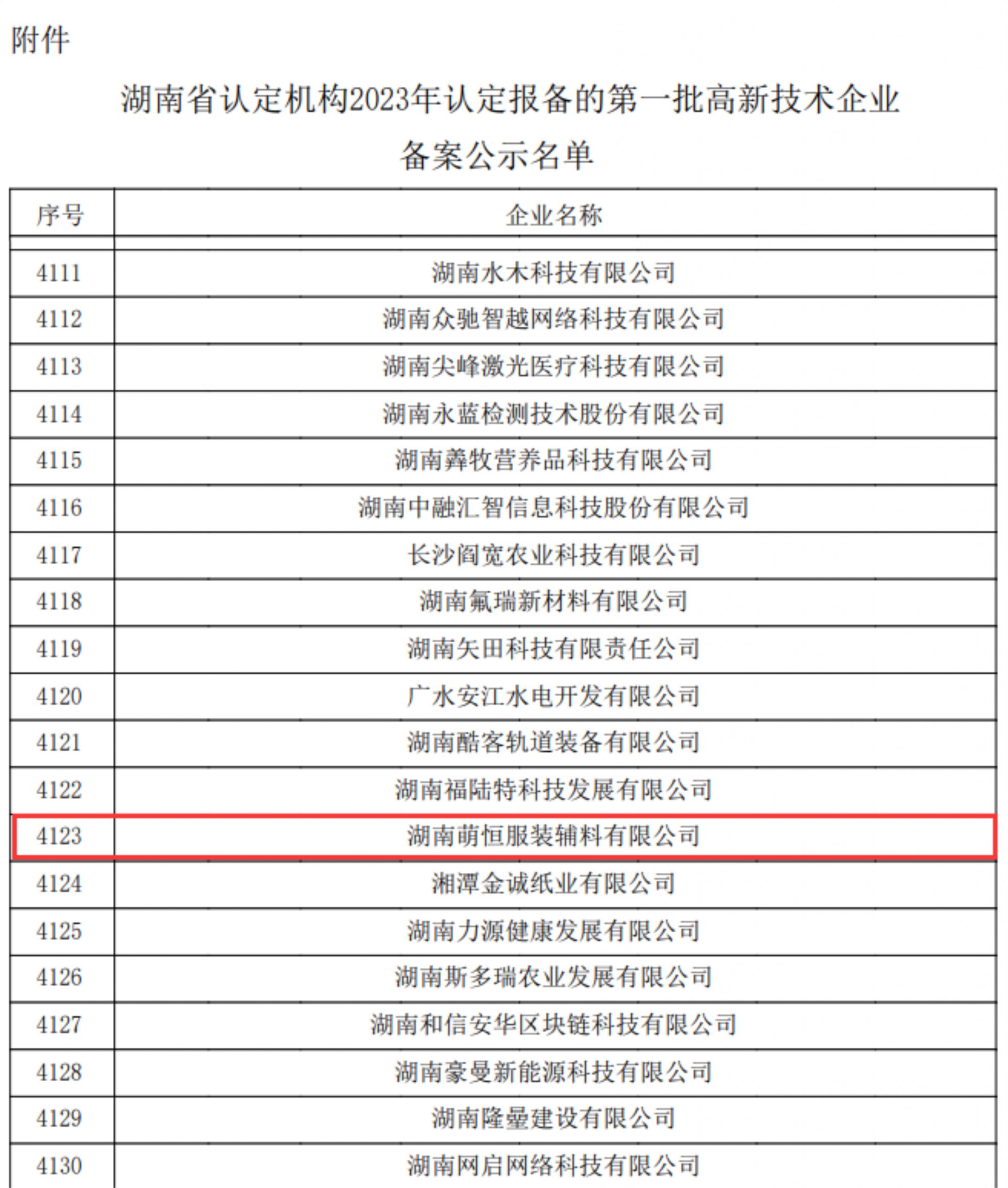 近日,通過(guò)各部門(mén)的精心準(zhǔn)備和籌劃,湖南萌恒服裝輔料有限公司順利通過(guò)了國(guó)家級(jí)高新技術(shù)企業(yè)復(fù)審認(rèn)定。