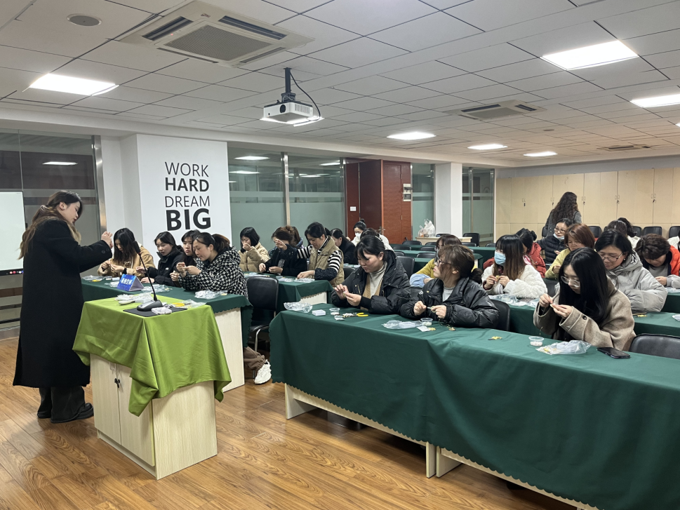 花邊事業(yè)部則開展了手作DIY自然原石胸針制作活動。在老師的細心講解下,大家先從頂托盤上入手,用細絲穿進一顆原石,固定住,然后沿著頂托上的小孔借助細絲把一顆顆原石固定在上面,原石形狀、顏色不一,大家互相交換不同顏色不同形狀的原石搭配到自己的作品中,就如同縫紉衣服一般精巧細致。
