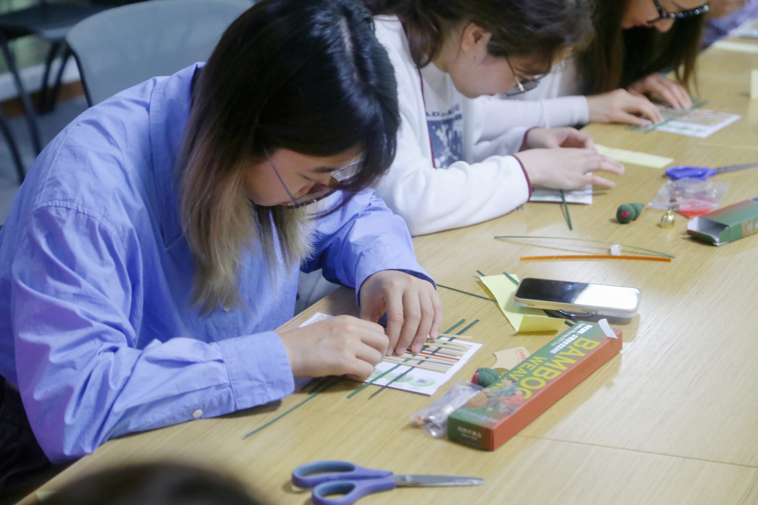 6月7日中午,當小伙伴們來到活動場地時,材料制作包早已整整齊齊地擺放在座位上。隨著全員有序落座,活動正式開始。在老師的耐心講解和視頻輔助下,大家專注而細致地開始穿竹引線,細長的蔑片在每個人的指尖上交互翻動。當制作遇到瓶頸時,有人向老師請教,有人和同伴探討,現場一片和樂的氛圍,超級有愛!