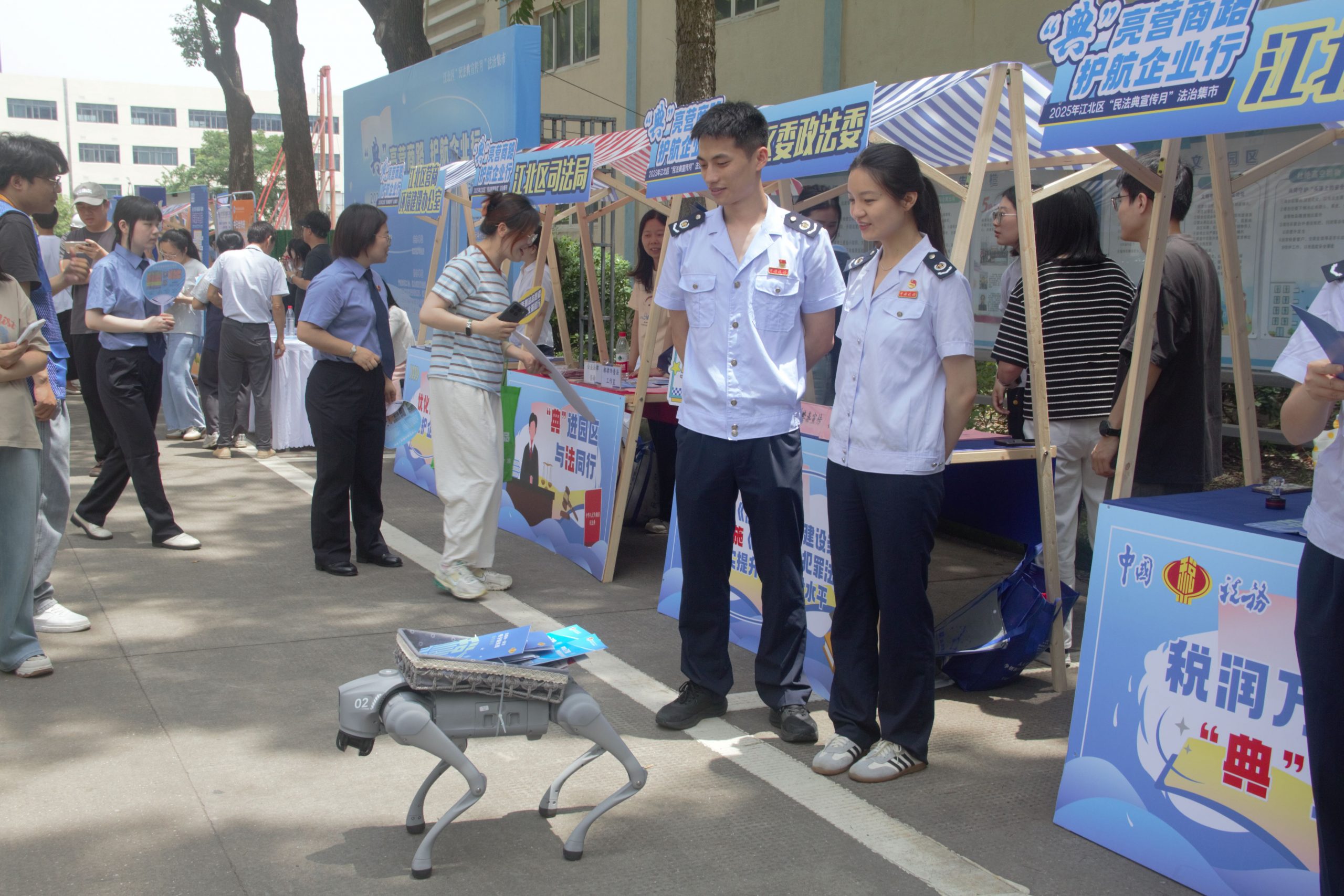 時(shí)近中午,樹(shù)蔭下的法治集市數(shù)余個(gè)特色攤位沿園區(qū)主干道兩側(cè)排開(kāi)。來(lái)自交通技工學(xué)校帶來(lái)的智能機(jī)器狗更成為全場(chǎng)的“明星”。它不僅外形萌趣可愛(ài),還馱著一摞精美的法治宣傳手冊(cè),仿佛一位小小的“普法使者”,時(shí)而靜坐招手賣(mài)萌,時(shí)而靈活穿梭人群,引得來(lái)往職工紛紛駐足互動(dòng),加入法治游戲中。