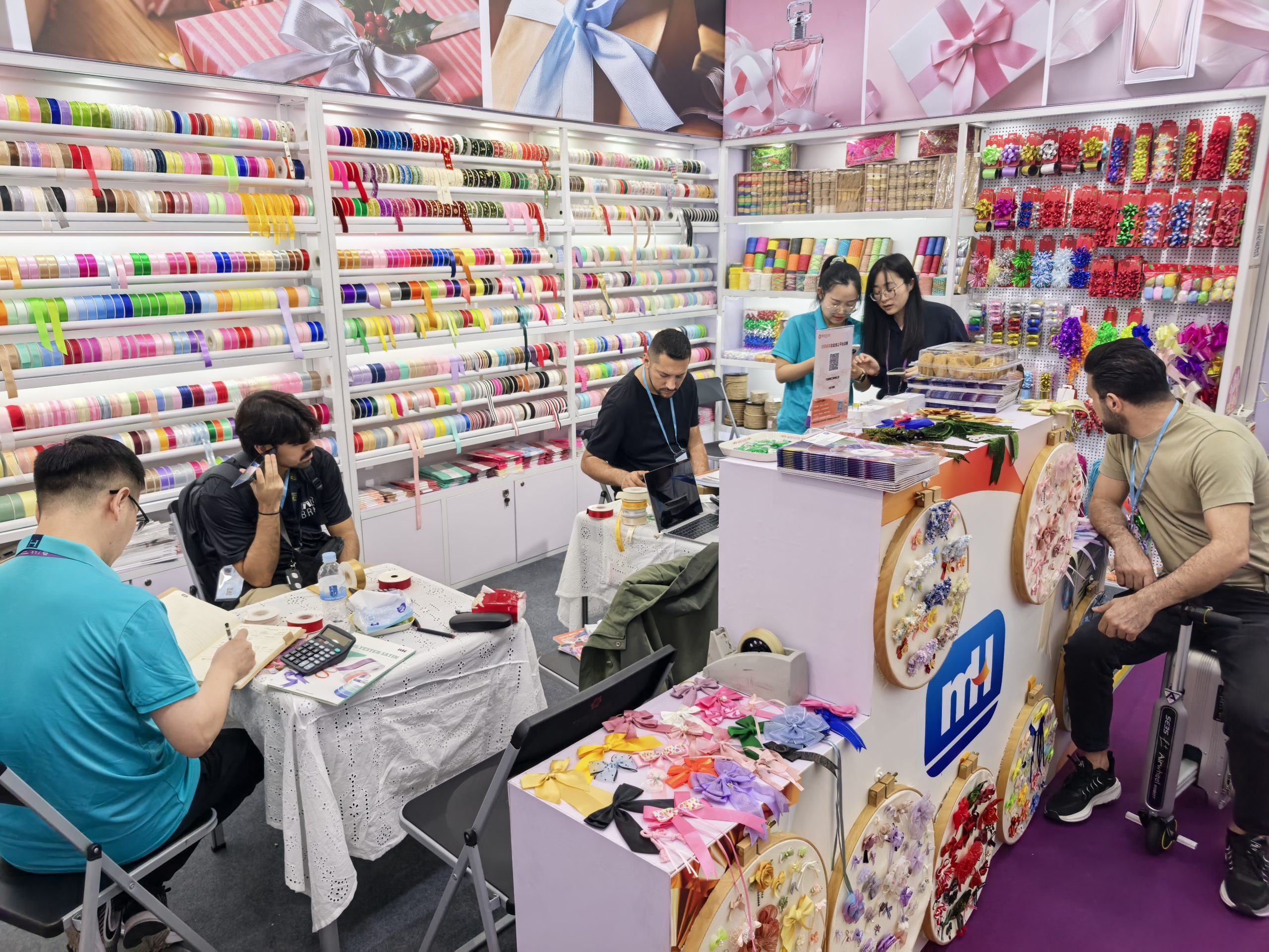 在為期五天的展期中,我司展位吸引了大量來自東歐、南歐、東南亞、中東及拉美等地區的客商駐足,人流量較為集中,洽談氣氛熱烈。除常規絲帶產品外,我司重點展示了TPU絲帶、超亮有光絲帶、全消光絲帶等30余種新品,其中非織絲帶產品因其獨特性能獲得客戶較高關注,有望成為市場新突破點。本次展位陳列產品跨度大、品類全,涵蓋包裝用繩帶及禮品裝飾材料,充分滿足客戶多樣化需求,展現了我司在供應鏈整合與產品創新方面的實力。