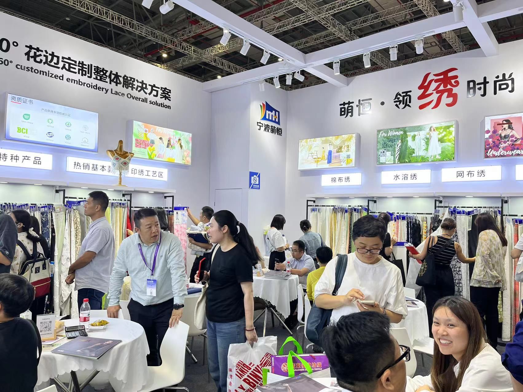 展會期間,我們憑借優質特色的產品和積極熱情的服務吸引了眾多中外商客駐足交流和合作洽談,體現產品和平臺實力的OEKO、BCI、GRS、RCS、OCS等認證也得到了廣泛的贊譽和認可。未來我們將不忘初心,繼續前行,以“領繡時尚”為使命,引領繡花面料行業新風尚。