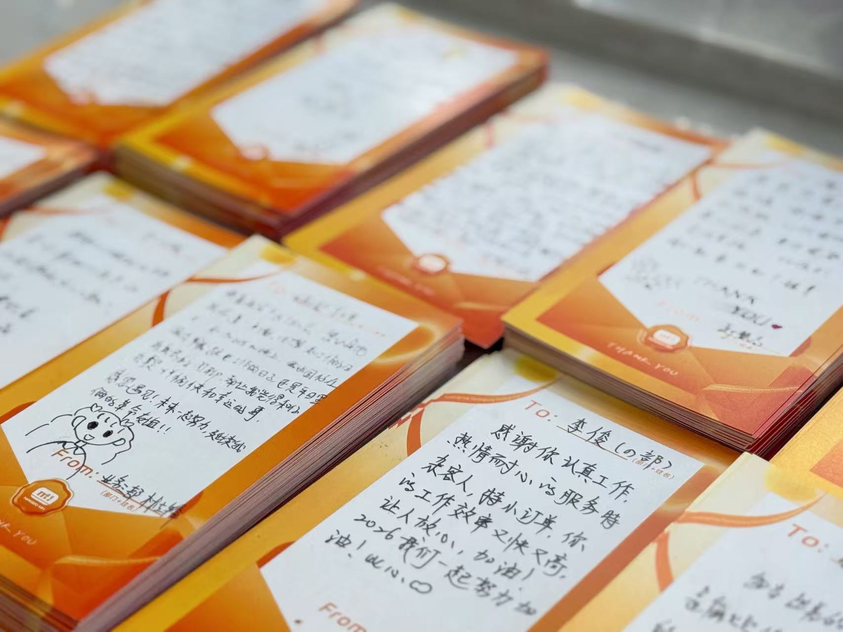 平日我們常忙于工作,可能忽略了表達(dá)謝意。此次活動特別設(shè)置線上、線下雙渠道感恩傳遞方式,每個人都能找到適合自己的表達(dá)方式。線上發(fā)送感恩留言,讓謝意穿越網(wǎng)絡(luò),實(shí)時抵達(dá);線下親手書寫卡片,將感謝化為文字,永久珍藏。下午同事們拿著卡片和禮物,親手交到想要感謝的人手中,所有的情誼在彼此交流的眼神中流淌。有人感謝伙伴的協(xié)作,有人感恩師父的指導(dǎo),有人感激團(tuán)隊的配合,每一個感謝背后,都藏著一個溫暖的故事。